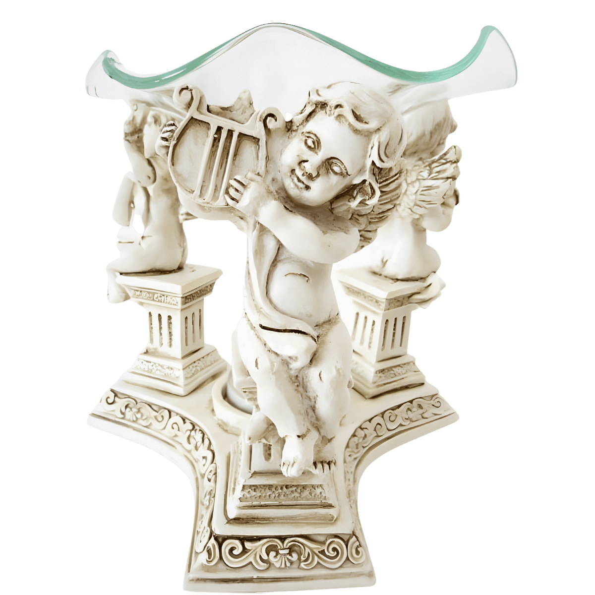 Resin oil burner in antique white with three angel figures seated on decorative pillars,