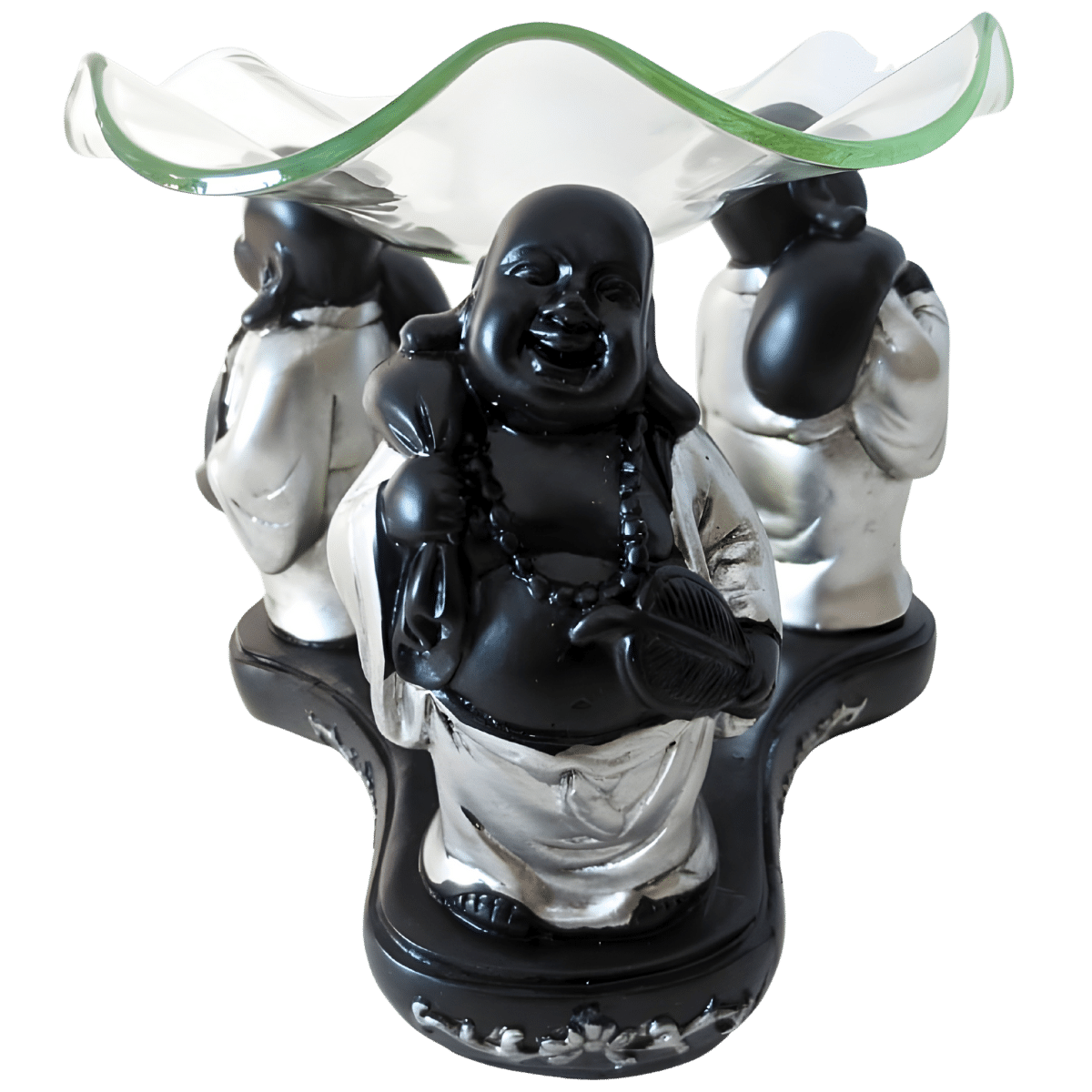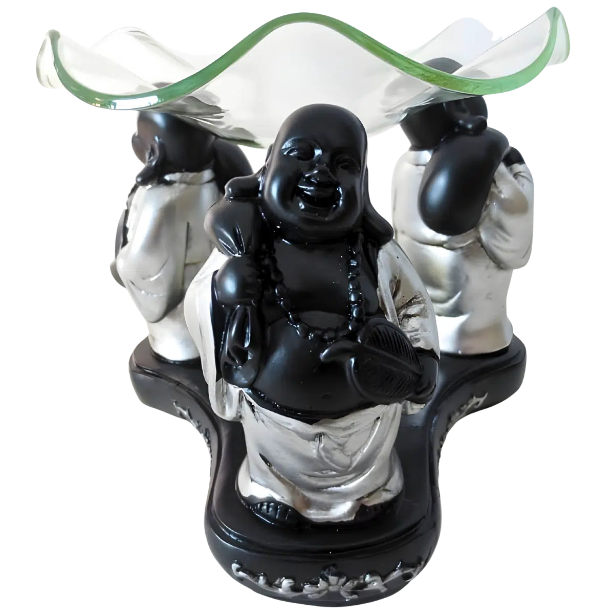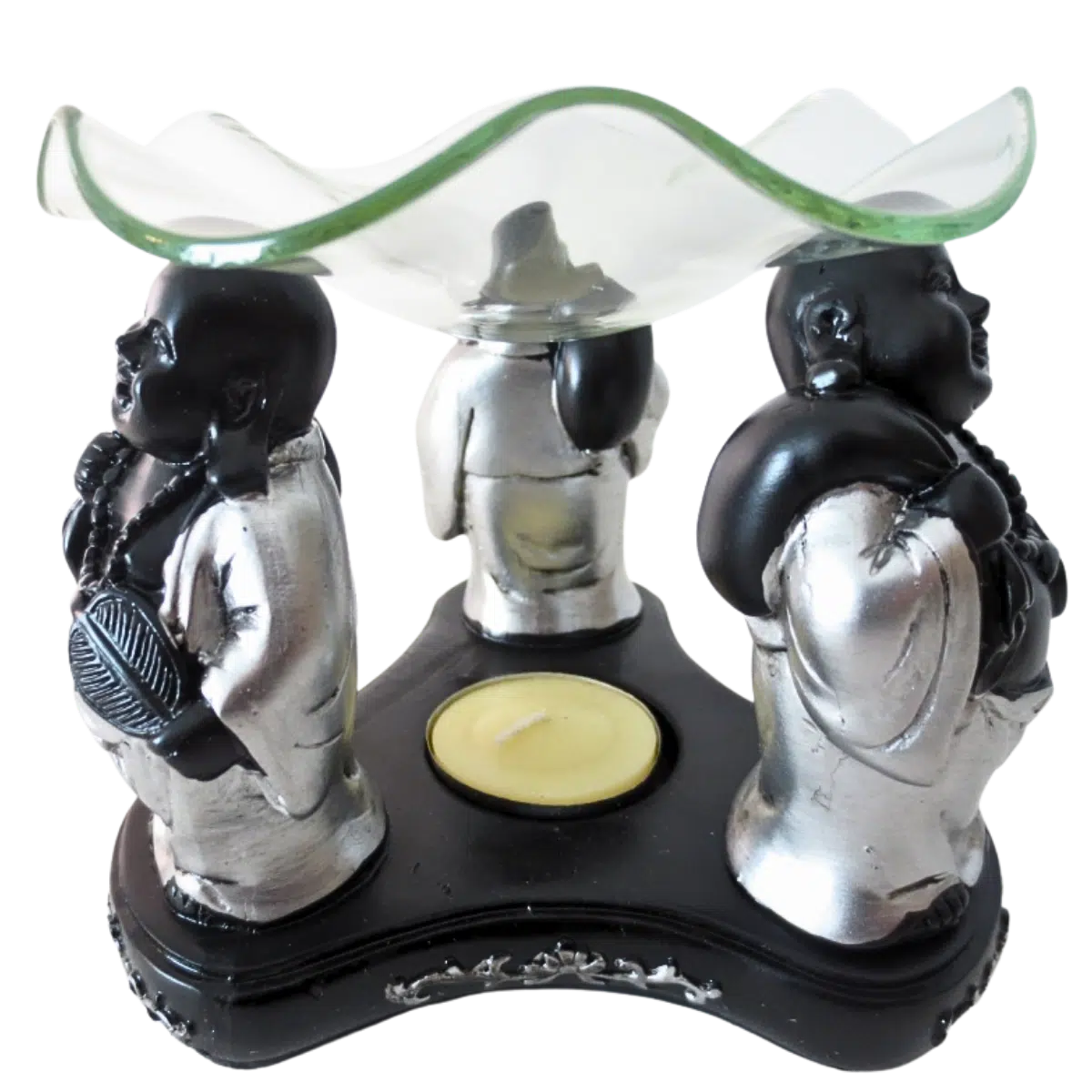 Resin oil burner with three laughing Buddhas arranged in a triangle, holding a wavy glass dish above their heads.