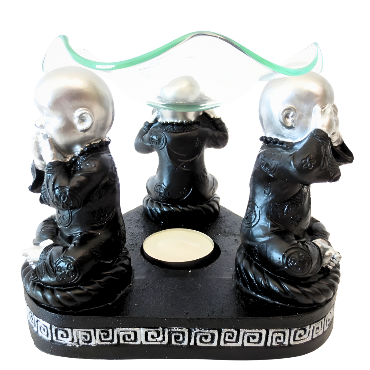 Decorative resin oil burner in silver and black with three monk figures on a shaped base.