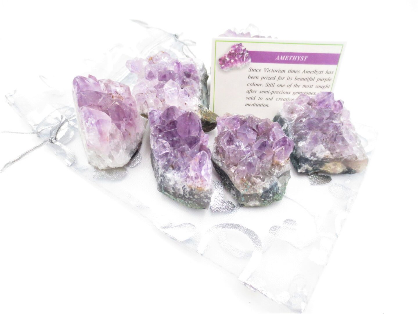 6 Amethyst Cluster stones packed in an organza bag. Comes together with a card with information and working of the gemstonegemstone size: 3-4cmMinimum purchase is 1 bag = 6 stones