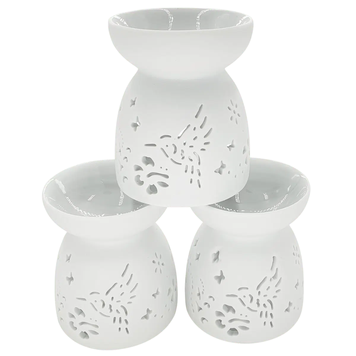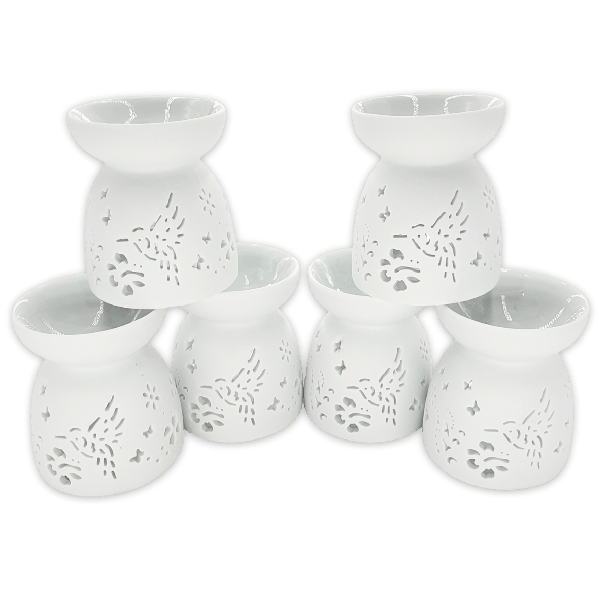 Compact white ceramic oil burner set with a delicate bird-and-star motif.