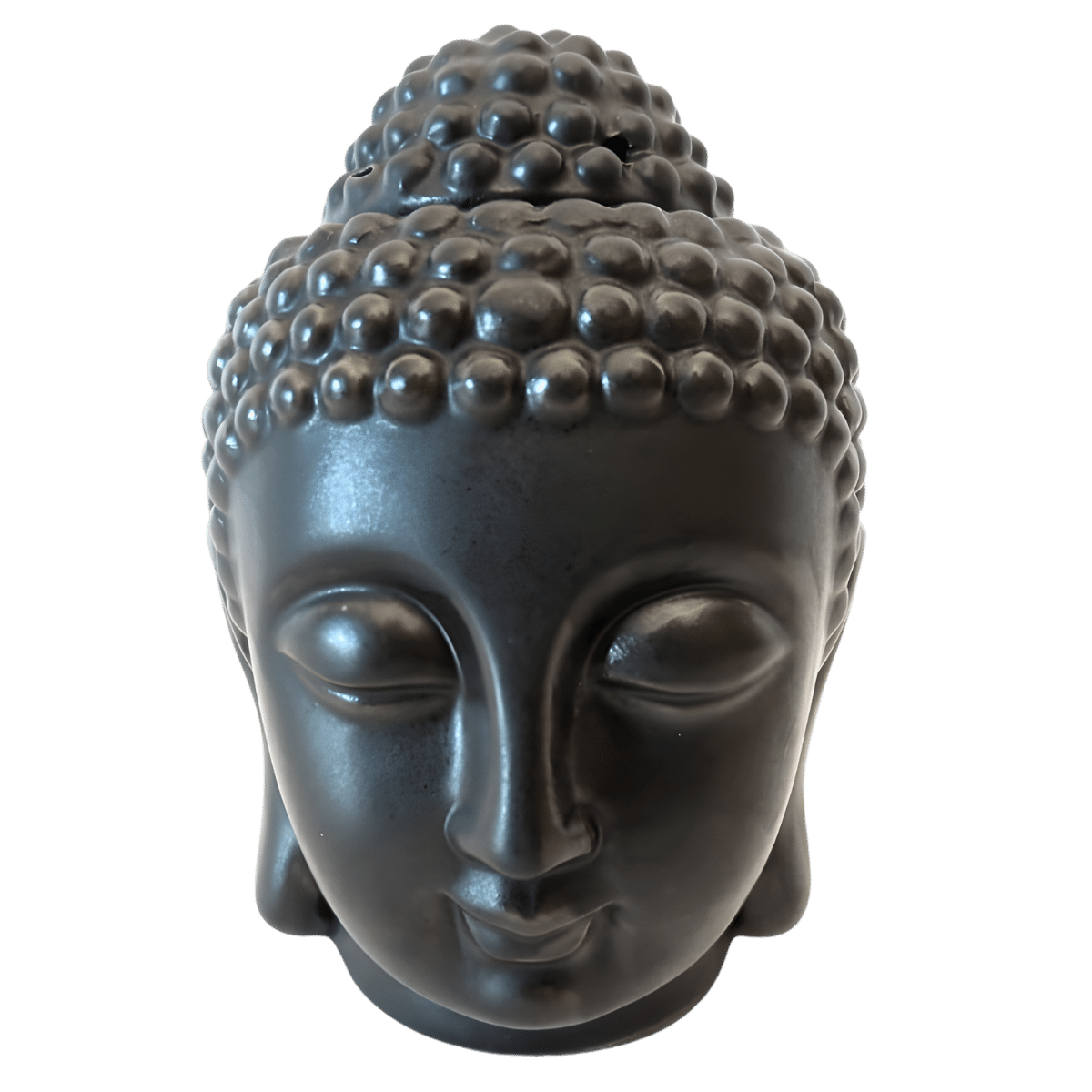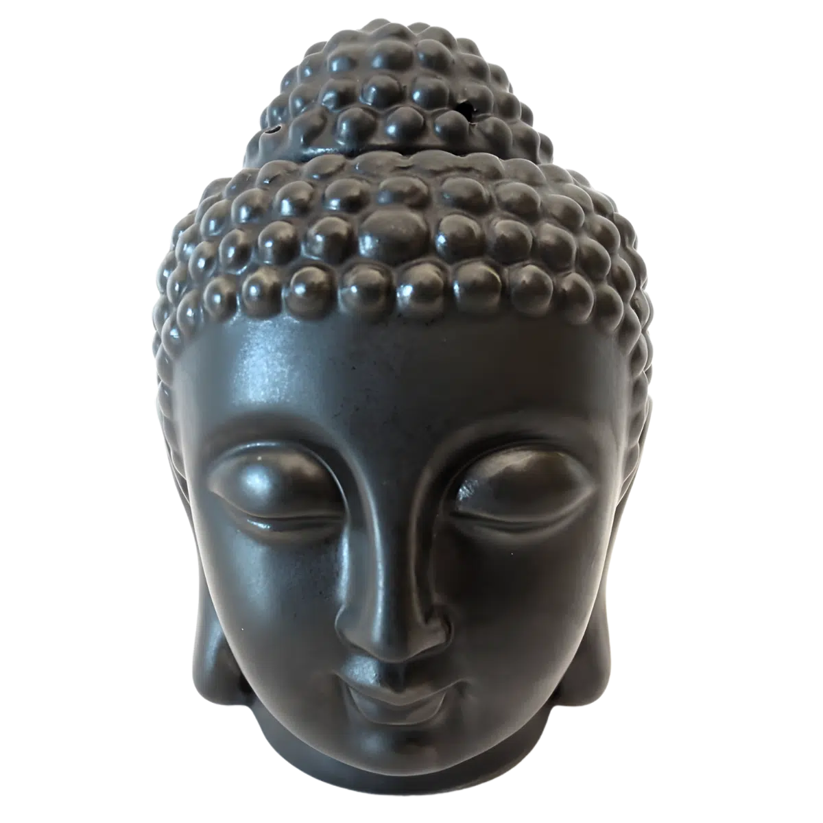Matte black ceramic oil burner in the shape of a serene Buddha head. The design consists of a hollow base with a cut-out at the back for placing a standard tealight and a matching removable top section with small ventilation holes. When a candle is lit, the light shines softly through the openings while the recessed dish inside the head gently warms fragrance oil or wax melts.