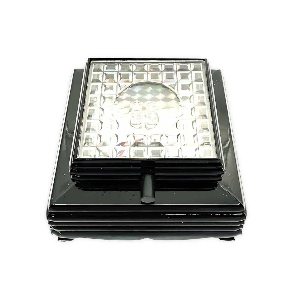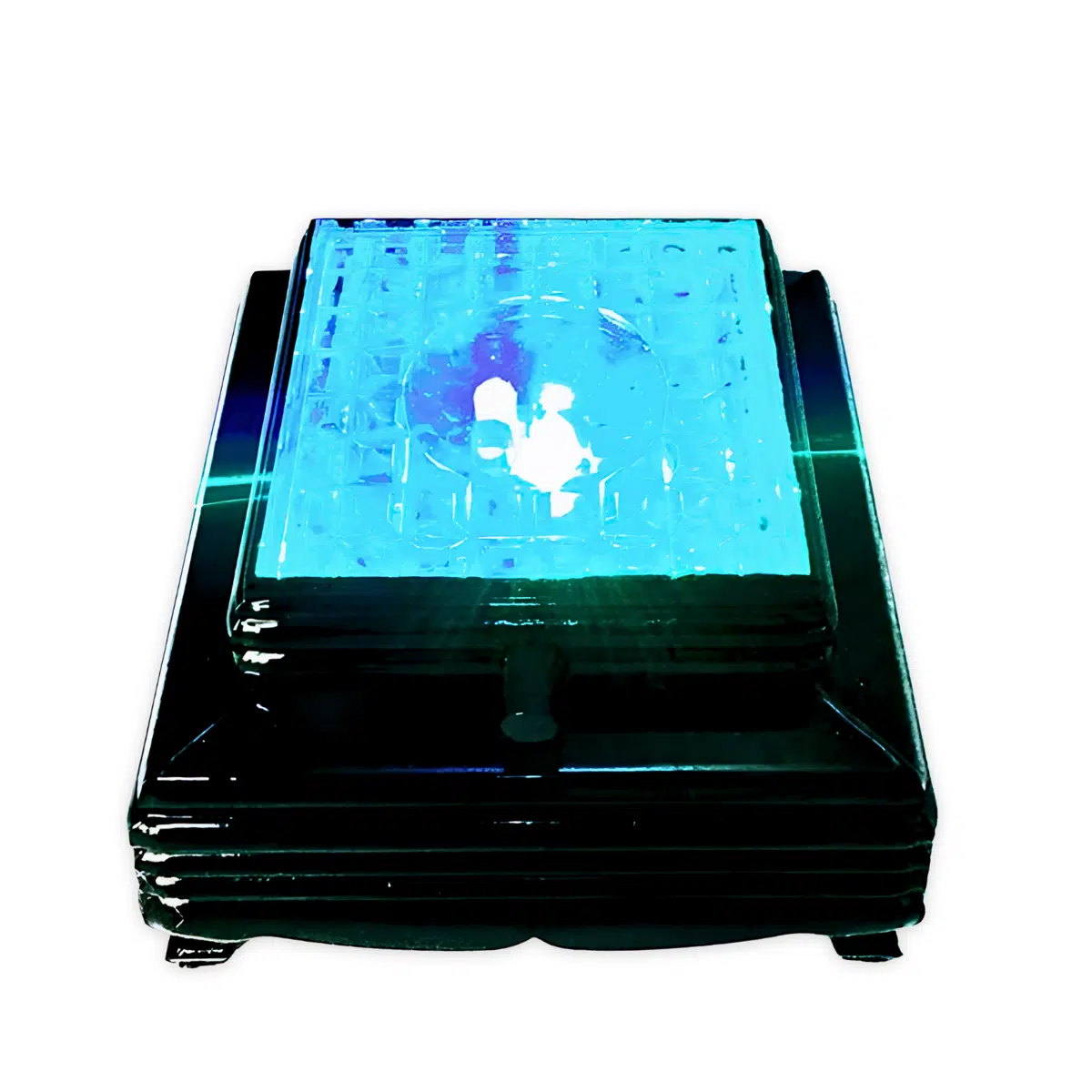 Compact square display light base with a black-coloured stepped frame and a clear patterned top plate. The base is battery-operated and requires 3 × AA batteries (not included). A central light shines upward through the surface to highlight crystals, glass ornaments or small statues placed on top, helping details and reflections stand out in a cabinet, shop display or home setting.