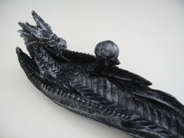 Black fantasy dragon incense holder. The dragon is in lying form and has a skull in his leg.