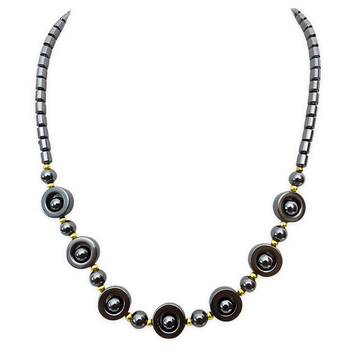 The necklace is made of haematite. You can see the product by clicking on the image. The minimum purchase is 2 pieces.