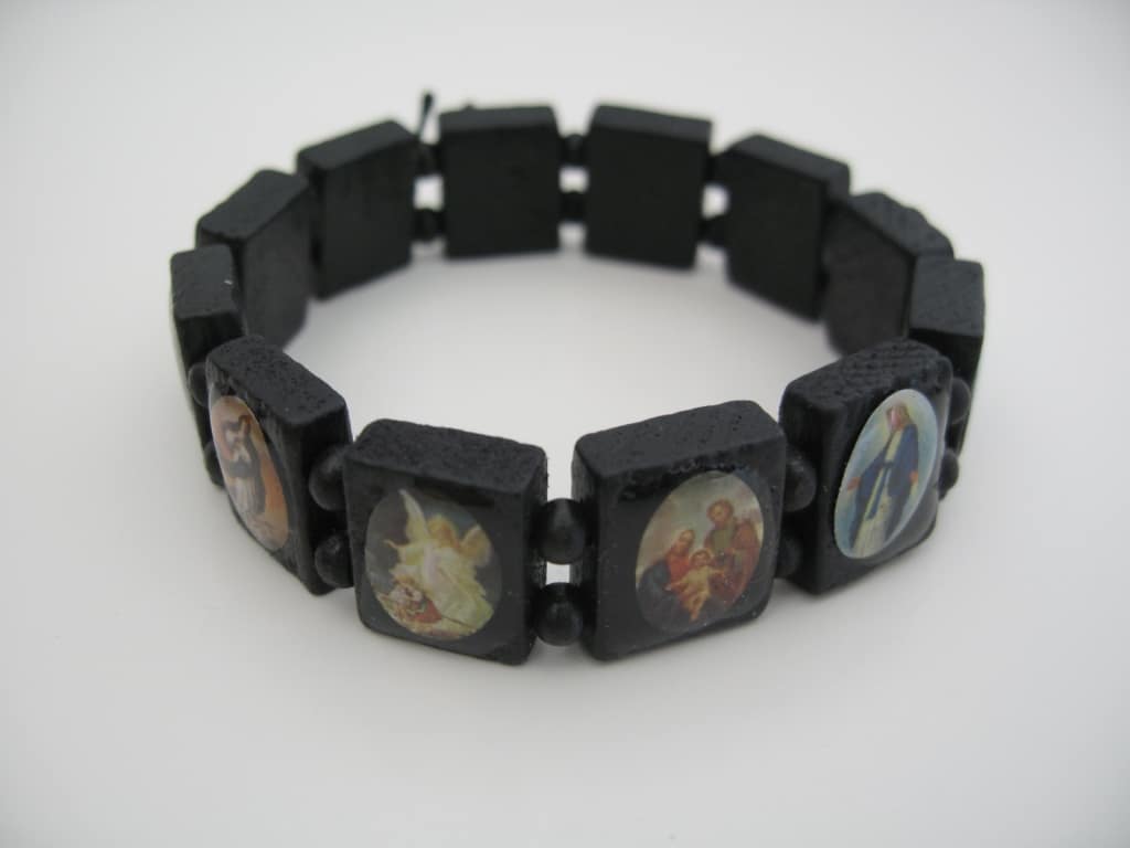Bracelet made of wood with different colored blessed people on it. Â