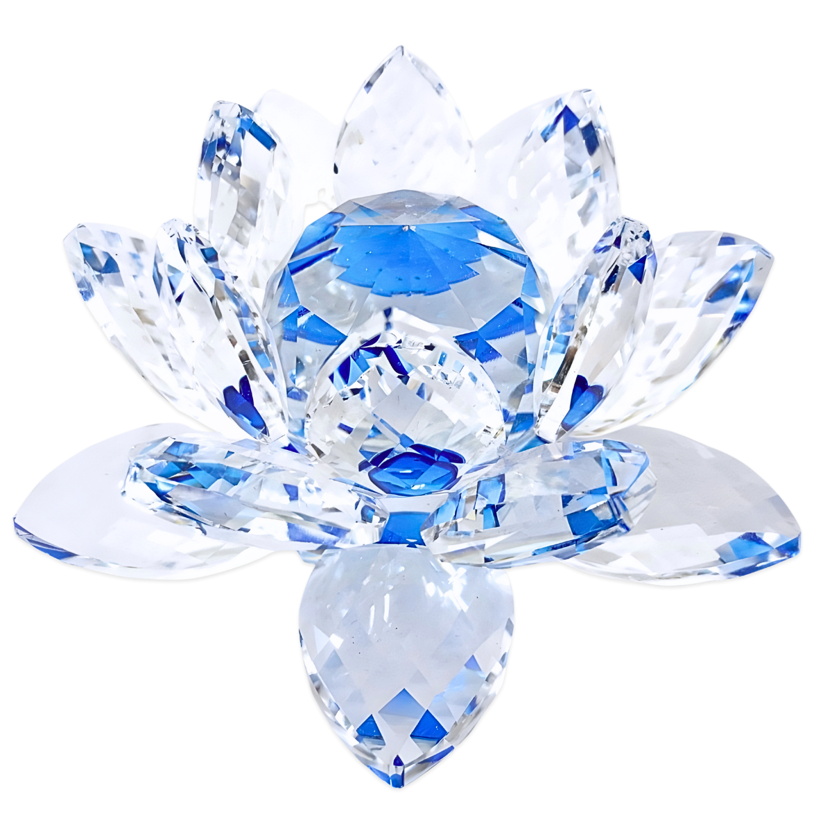 Compact faceted crystal glass lotus flower ornament with layered clear petals and soft sapphire-blue accents. The raised centre stone and petal facets catch the light to produce gentle reflections, making it a neat accent for shelves, window sills or crystal display stands. In Feng Shui the crystal lotus is often used as a symbol of purity, balance and harmonious energy, with blue tones linked to calmness and clear communication.