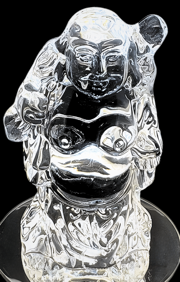 Small standing Happy Buddha figure in clear crystal glass with rounded belly, smiling face and flowing robe, carrying a bundle over one shoulder.
