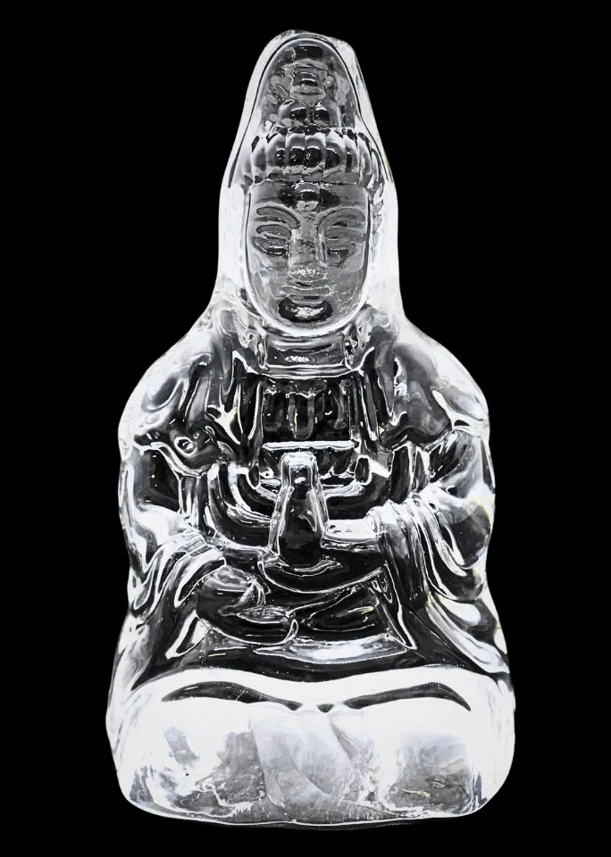 Compact sitting Kwan Yin figure in clear crystal glass, with detailed robe and headdress, hands folded at the front in the style of the Buddhist bodhisattva of compassion (Guanyin / Kuan Yin).