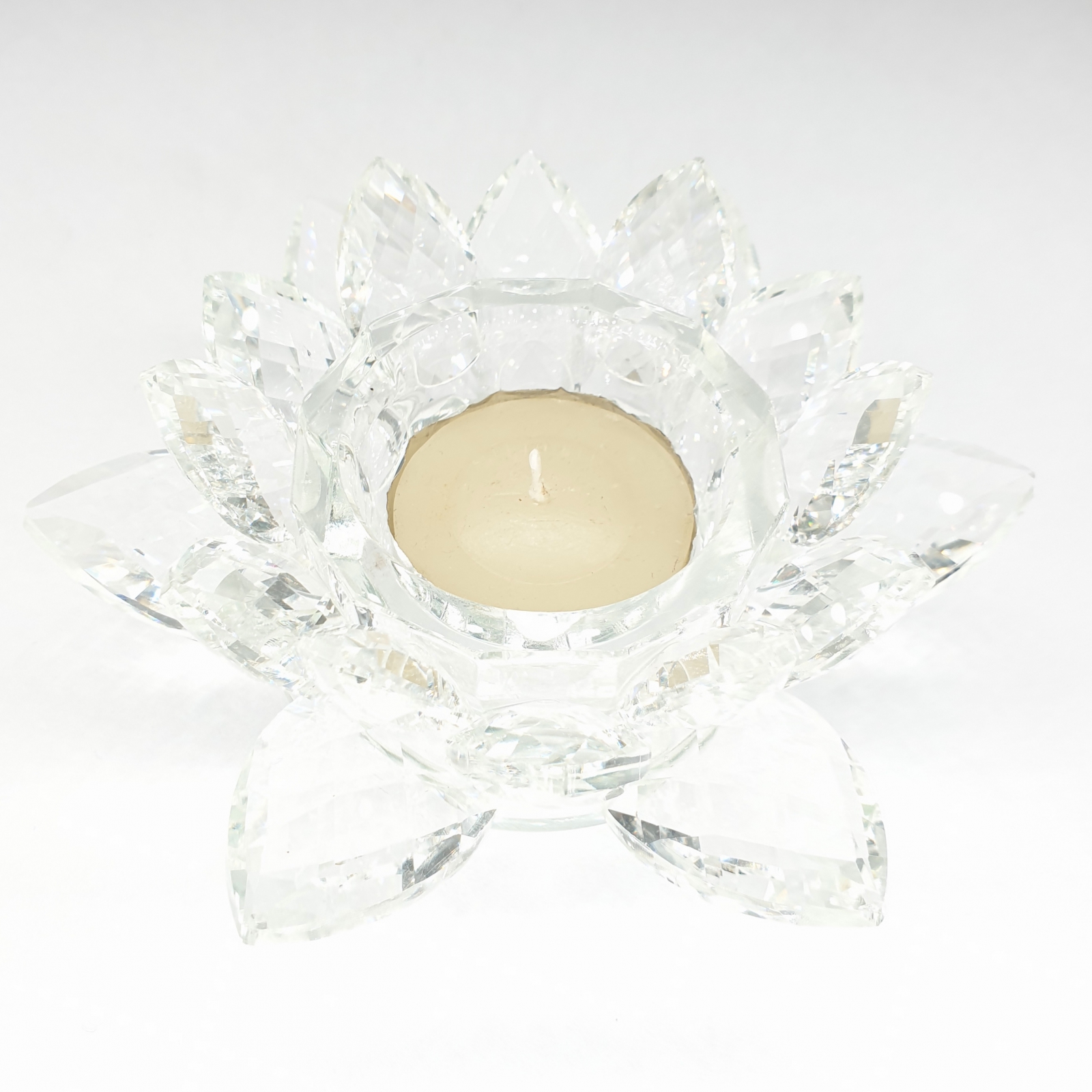 Clear crystal-glass lotus tea light holder with layered, faceted petals and a round cup in the centre for a standard tealight or LED candle. The cut surfaces catch and reflect the flame, making it a simple decorative accent for altars, massage rooms, living spaces or shop displays. Candle not included.