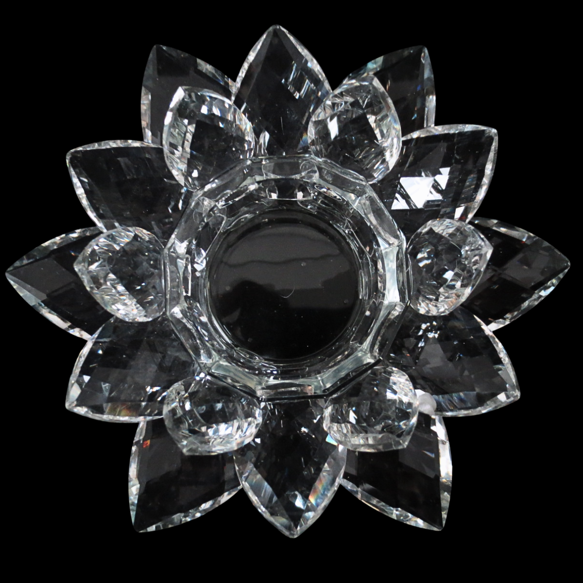 Large clear crystal-glass lotus with layered, faceted petals and a round recess in the centre for a tealight candle. The polished cut surfaces catch and reflect candlelight to create a soft, shimmering glow, making it suitable for meditation spaces, altars, spa interiors, and window or table displays.