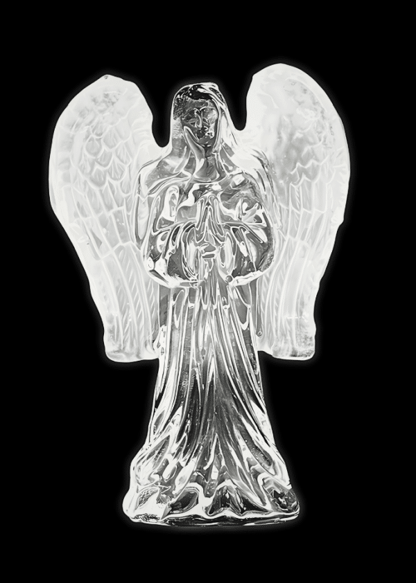 Small standing angel figure with folded hands and detailed wings, made from clear crystal glass.