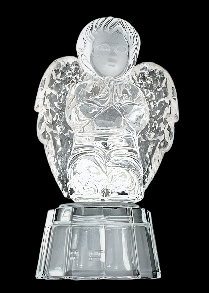 Small crystal glass statue of a kneeling angel child with folded hands and textured wings, set on a faceted pedestal base. The mix of clear and frosted surfaces gives a soft, decorative look, often used as a small guardian angel or gift.