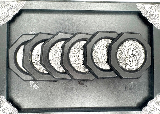 Wholesale – Thai Style Elephant Embossed Metal Coaster Set with Wooden Tray