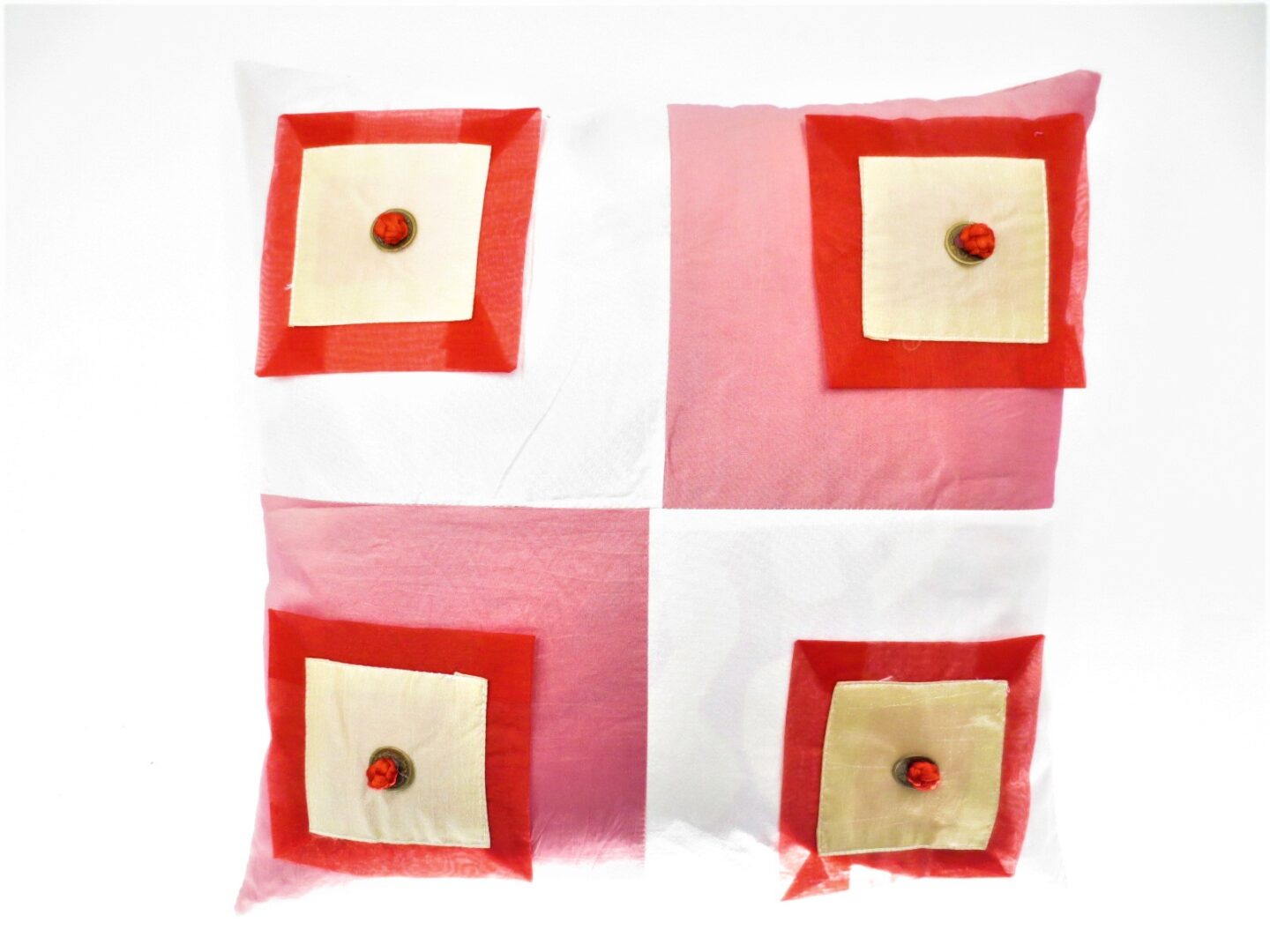 Very nice cushion cover, the middle is divided in squares with in each square a lucky coin. The cover has the colours white and pink