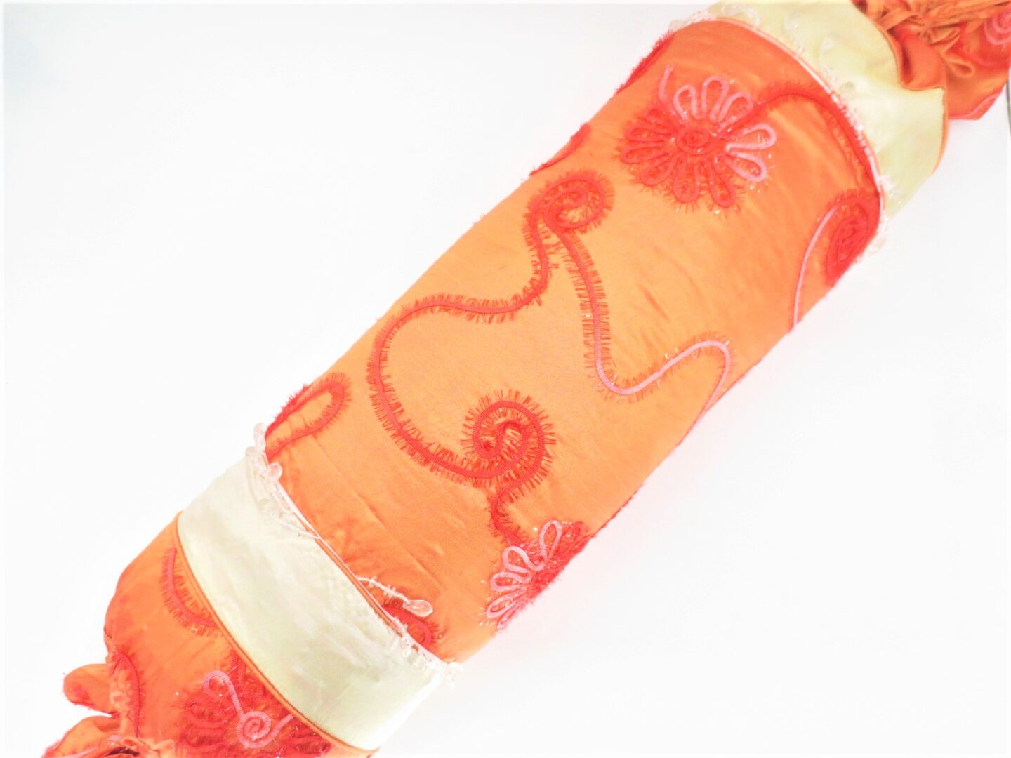 Very luxury cushion cover for the couch or bed. This cover is very nicely decorated with stitched flowers on the cover. There are also small red cristals hanging on the cushion cover. At the end of the cover there is a knot. The cover has the colours yellow and orange.