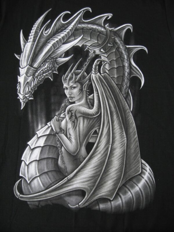 Black t-shirt with an elf and dragon. Both sides is printed, frontside ( colored) and backside (black/white) Minimum purchase is 1 piece