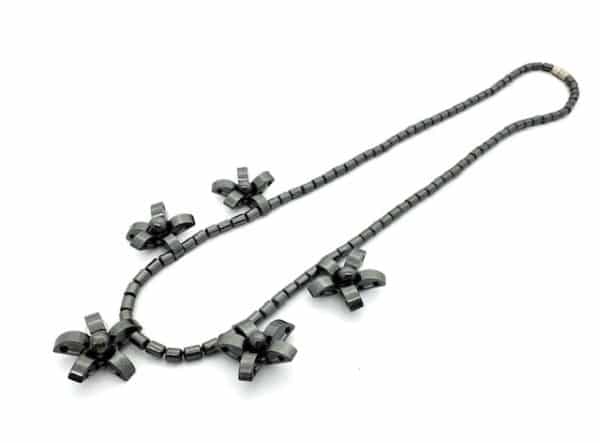Add a touch of modern sophistication to your style with this stunning flowers bead hematite necklace. Crafted from polished natural hematite, each sleek, metallic-gray bead is precisely shaped and connected to create a bold yet elegant design. Its subtle shine and smooth texture make it a versatile accessory for both casual and formal occasions. Known for its grounding and balancing properties, hematite not only enhances your look but also promotes a sense of calm and strength. Adjustable for a perfect fit, this unique piece is ideal for men and women who appreciate contemporary jewelry.