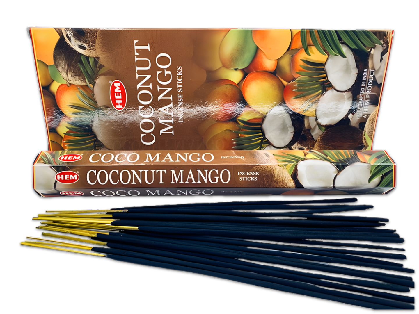 HEM Coconut Mango Hexa incense blends creamy coconut with the juicy sweetness of ripe mango. The tropical, fruity fragrance is ideal for creating a relaxed, holiday-like mood in living rooms, bedrooms, wellness areas and boutiques.