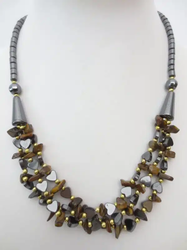 Beautiful hematite necklace with tigereye stones and hematite hearts. This necklace has 3 layers. The necklace is 45cm long Minimum purchase is 2 pieces