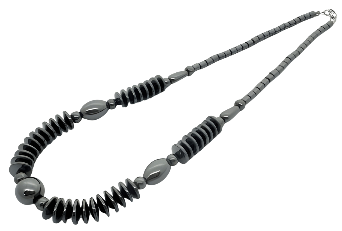 Add a touch of modern sophistication to your style with this stunning bead hematite necklace. Crafted from polished natural hematite, each sleek, metallic-gray bead is precisely shaped and connected to create a bold yet elegant design. Its subtle shine and smooth texture make it a versatile accessory for both casual and formal occasions. Known for its grounding and balancing properties, hematite not only enhances your look but also promotes a sense of calm and strength. Adjustable for a perfect fit, this unique piece is ideal for men and women who appreciate contemporary jewelry.