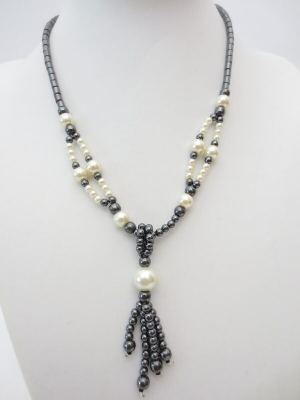Add a touch of modern sophistication to your style with this stunning bead hematite necklace with pearls. Crafted from polished natural hematite, each sleek, metallic-gray bead is precisely shaped and connected to create a bold yet elegant design. Its subtle shine and smooth texture make it a versatile accessory for both casual and formal occasions. Known for its grounding and balancing properties, hematite not only enhances your look but also promotes a sense of calm and strength. Adjustable for a perfect fit, this unique piece is ideal for men and women who appreciate contemporary jewelry.