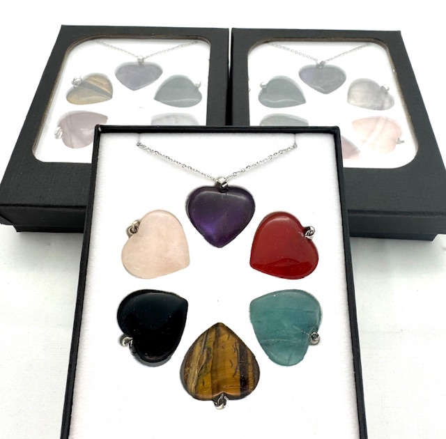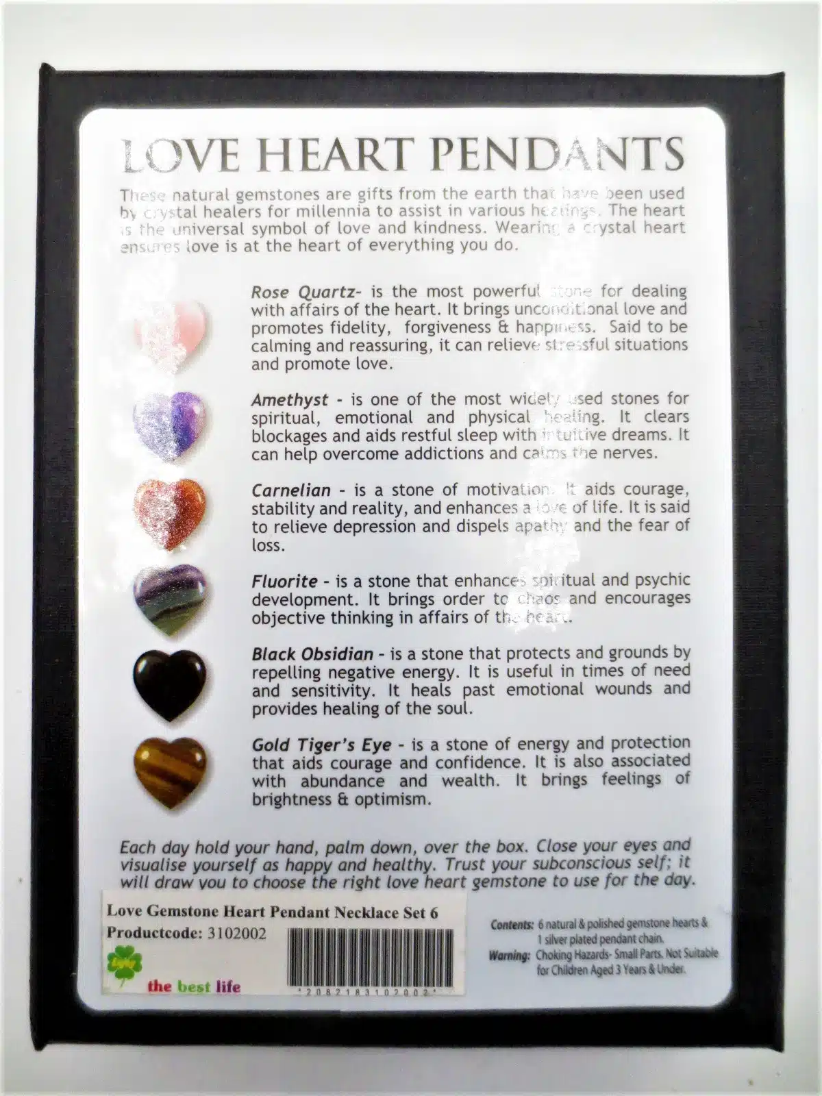 This elegant gemstone necklace set features heart-shaped pendants made from rose quartz, amethyst, carnelian, flourite, black obsidian and gold tiger’s eye. Each crystal is believed to carry healing properties and positive energy. Beautifully packaged in a gift box, this set is perfect for spiritual jewelry lovers, thoughtful gifts, or personal energy balancing.