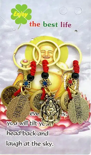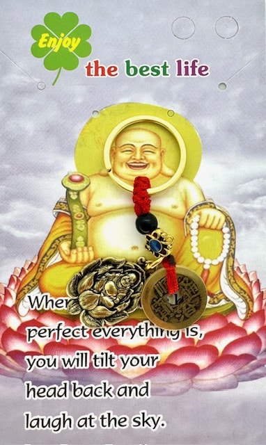 Each key ring contains 5 copper qing coins with a Buddha. On the back of the Buddha is a Chinese saying “Keep smiling”. The price is for 1 piece, each key ring comes with a Buddha card and a plastic bag.
