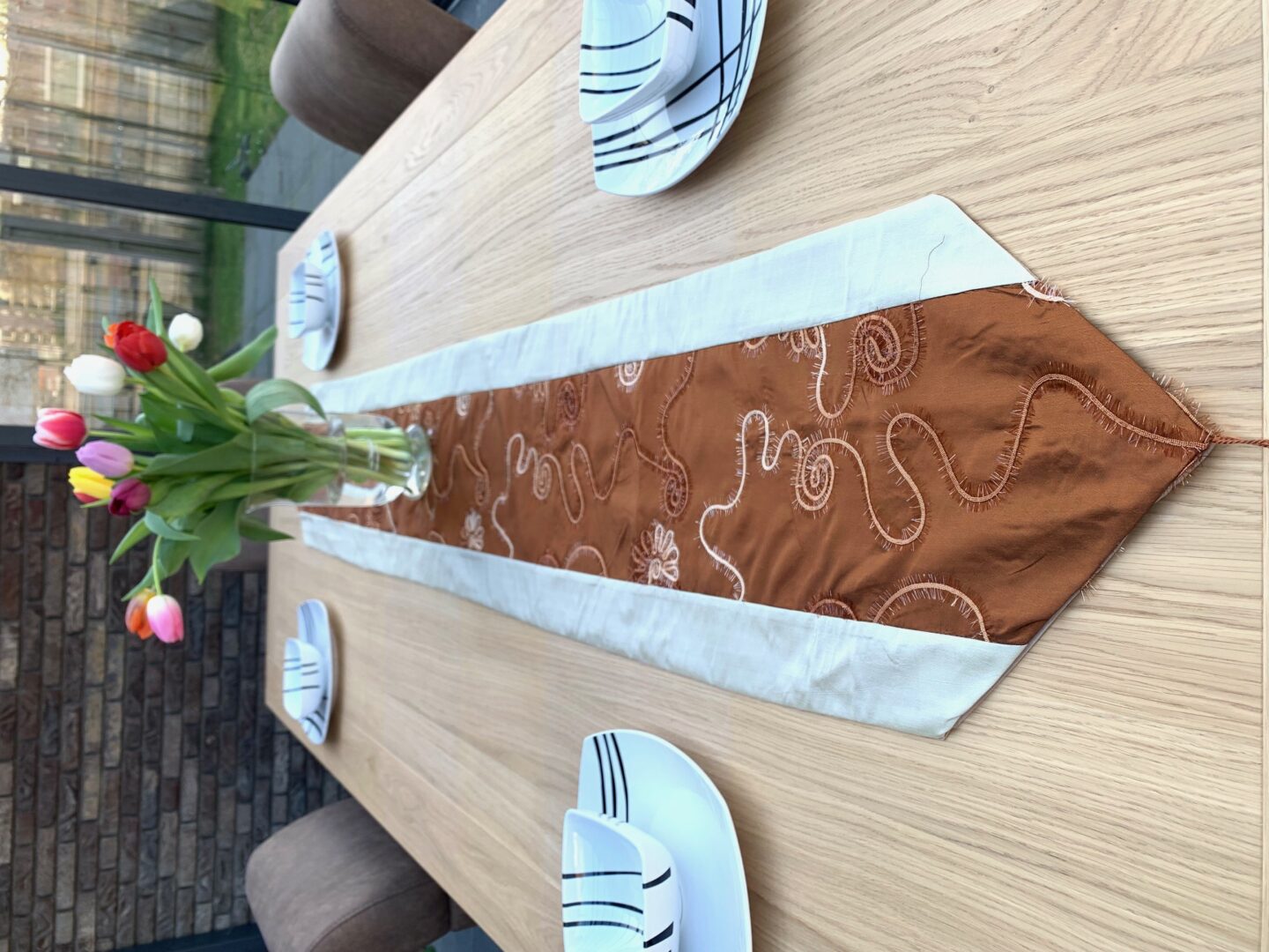 This beautifully crafted embroidered table runner brings elegance and warmth to your dining space. Featuring a rich brown center with delicate stitched patterns framed by cream edges, it adds a refined touch to any table setting. Ideal for daily use or special occasions, this table runner protects your tabletop while elevating your décor. Perfect for dining tables, coffee tables, or consoles, it complements both modern and traditional interiors. Pair it with fresh flowers or candles for an inviting, stylish look that impresses guests and enhances your home ambiance effortlessly.