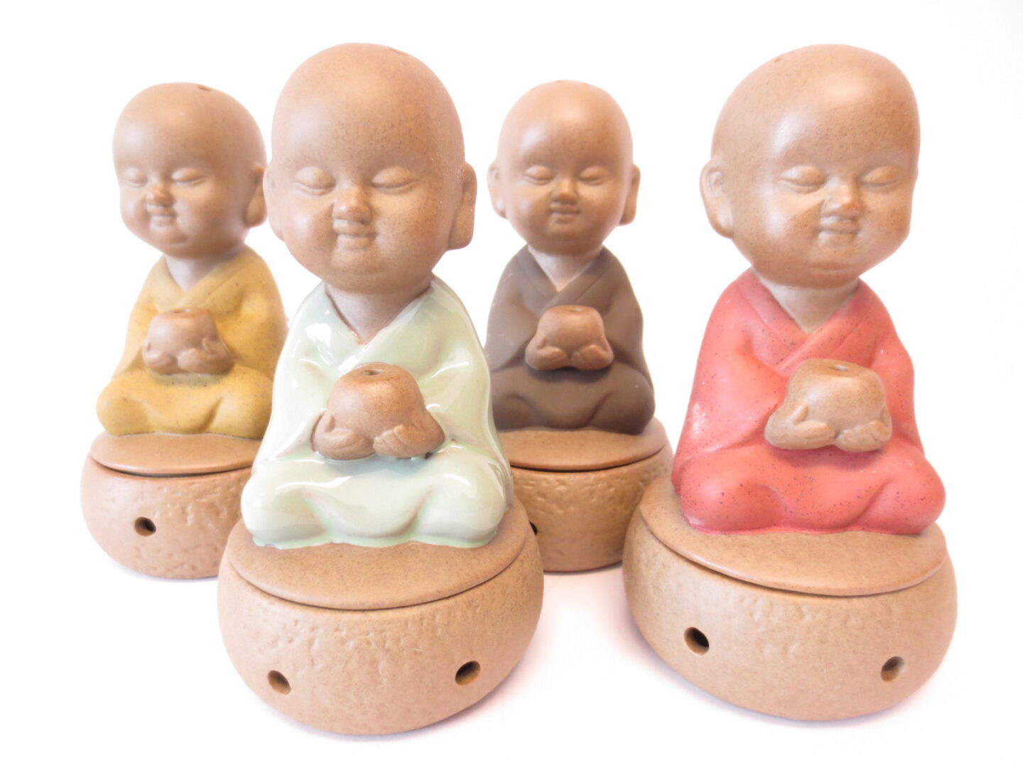 Beautiful incense / cone burner with 4 monks in different colors. The monk has a bowl in his hand. Under the monk there is room for burning an incense cone The cone’s smoke is released through the monk’s head, with holes in it.The incense / cone burner is made of fine pottery.Price is per set of 4