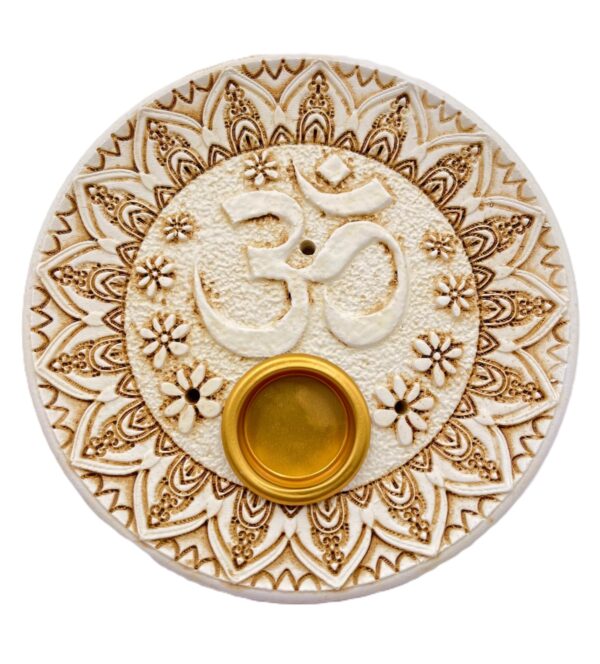The incense holder is white and has a round shape with the Ohm symbol in the middle.