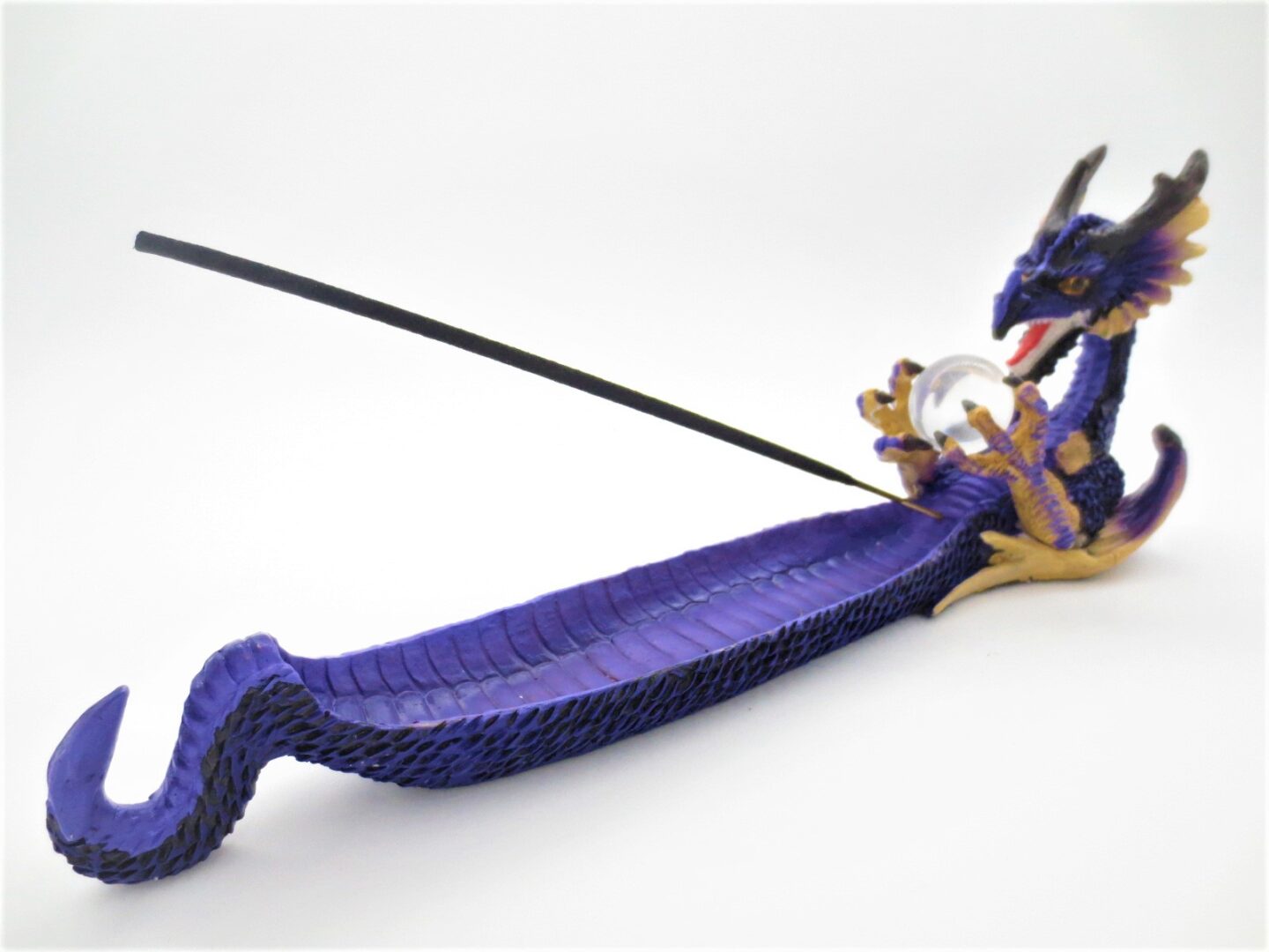 Purple fantasy dragon incense holder. The dragon is in lying form and has a crystal ball in his leg.