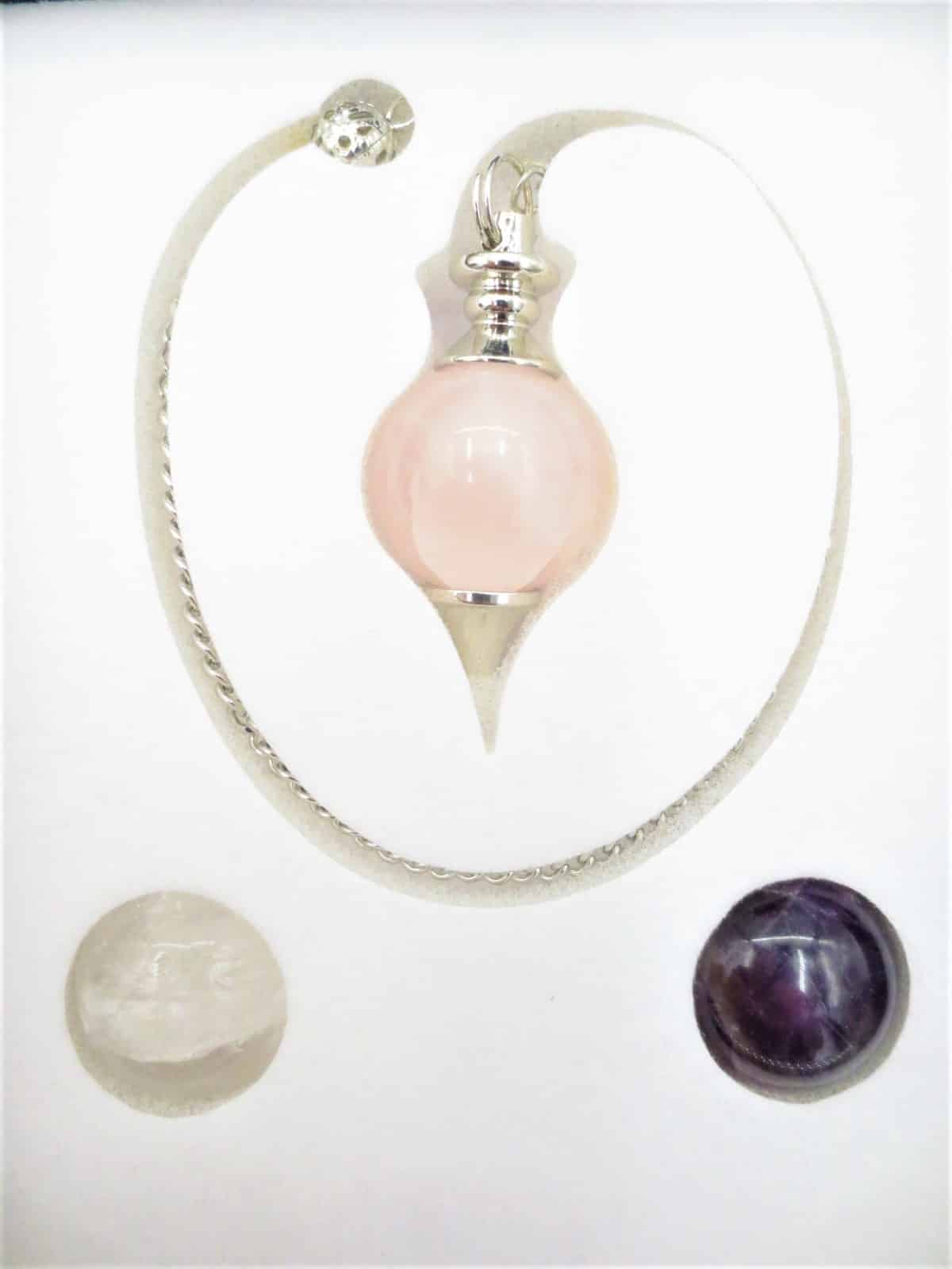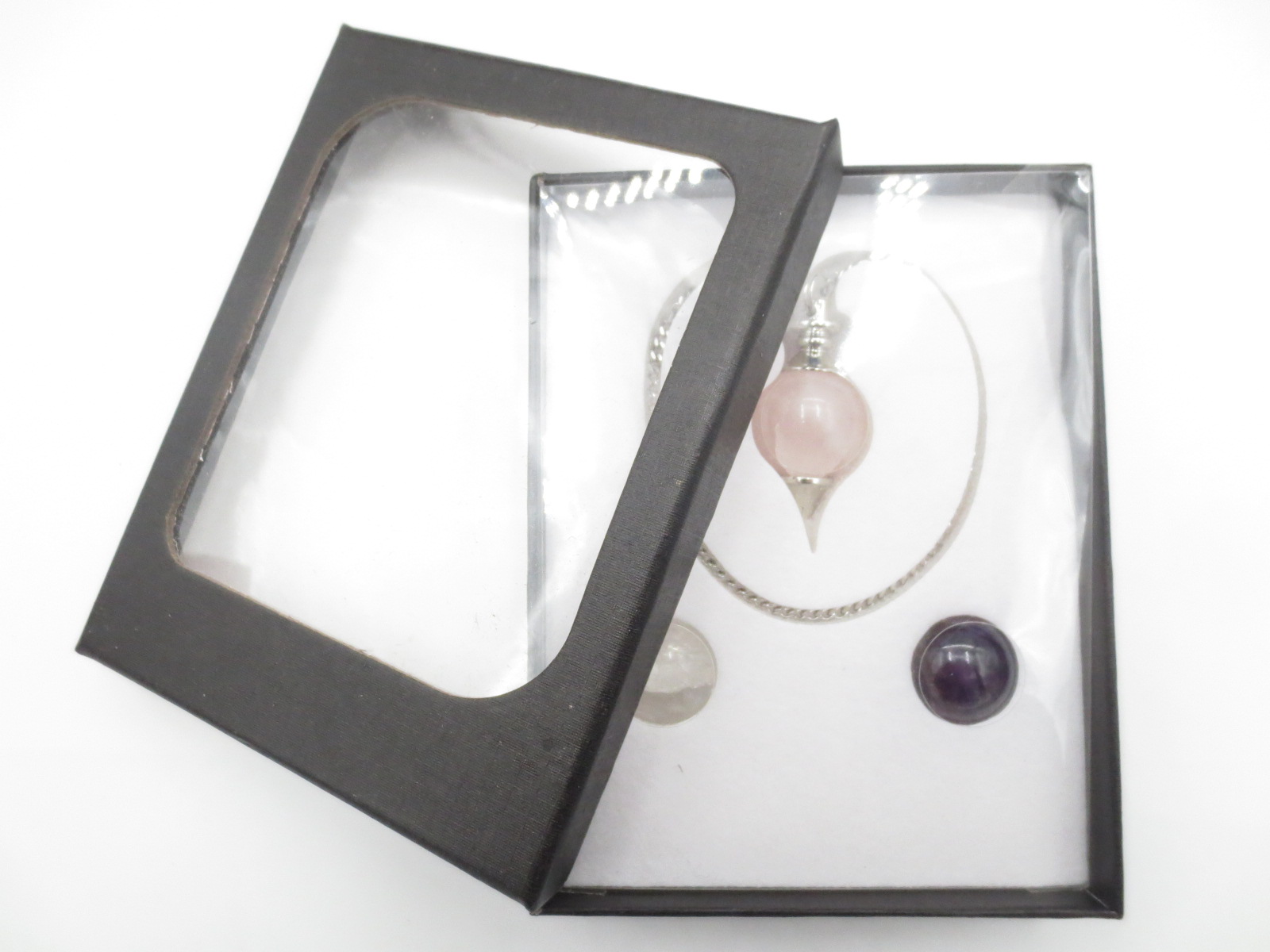 This elegant gemstone pendulum set features ball-shaped pendants made from rose quartz, amethyst, and gold tiger’s eye. Each crystal is believed to carry healing properties and positive energy. Beautifully packaged in a gift box, this set is perfect for spiritual jewelry lovers, thoughtful gifts, or personal energy balancing.