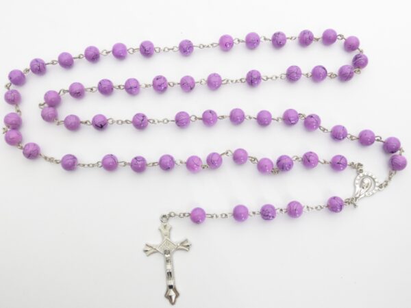 Steel necklace and steel cross and jezus with purple colour beeds. the Rozenkrans is 110cm long. Cross = 4 cm; Beeds = 8 mm Minimum purchase is 3 pieces