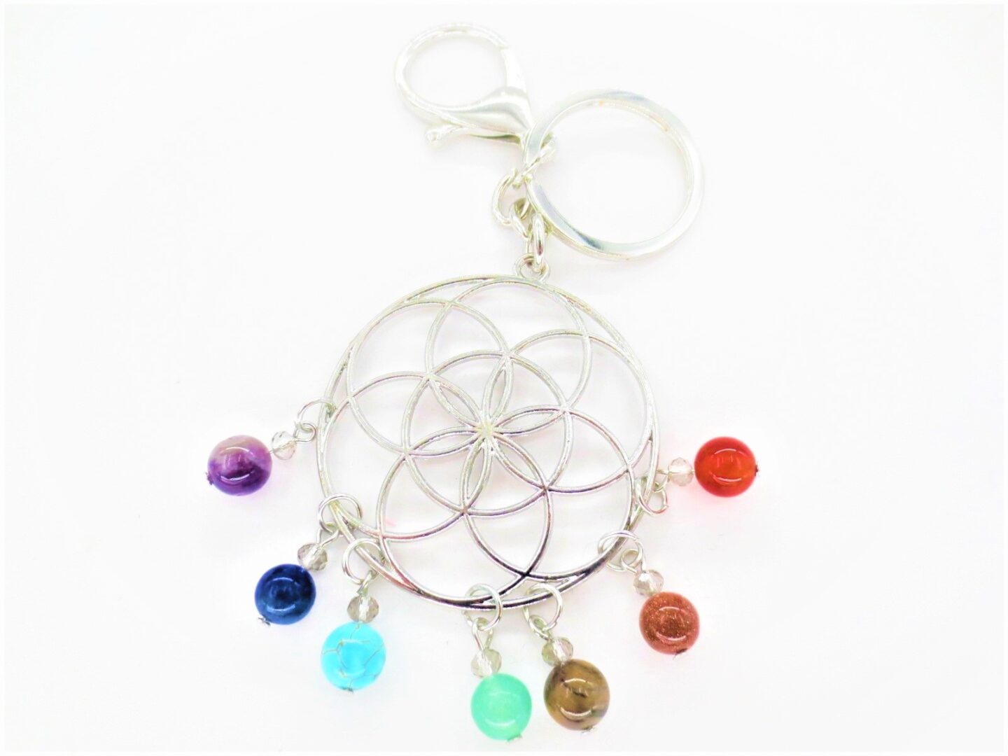 Flower of life key ring with mixed gems, made of stainless steel.Comes in a package with card and description and meaning of the flower of life.
