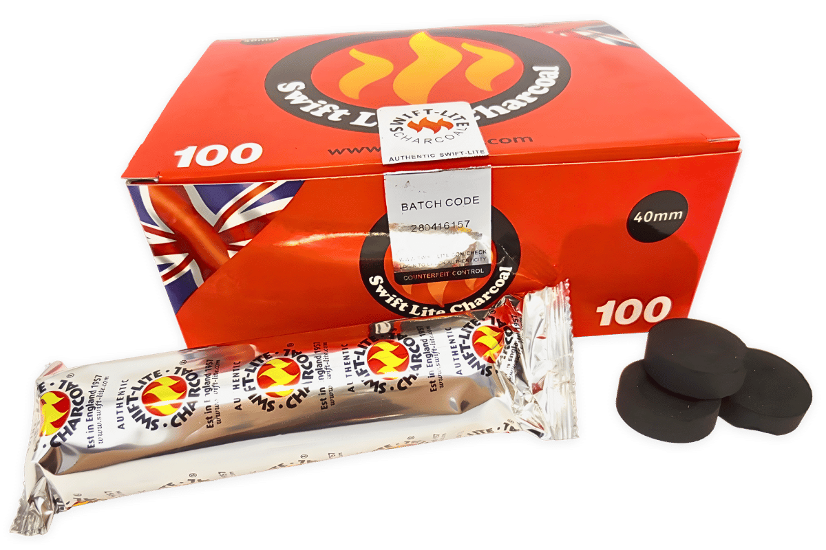 This box contains 100 Swift-Lite Charcoal tablets for incense burning. The tablets are packed in rolls of 10 and are sealed in an airtight pack in order to maintain efficient combustion. In order to maintain freshness open rolls should be re-sealed and returned to the box which should be kept closed and stored in a cool dry place. Effective storage will ensure quick lighting and long burning.