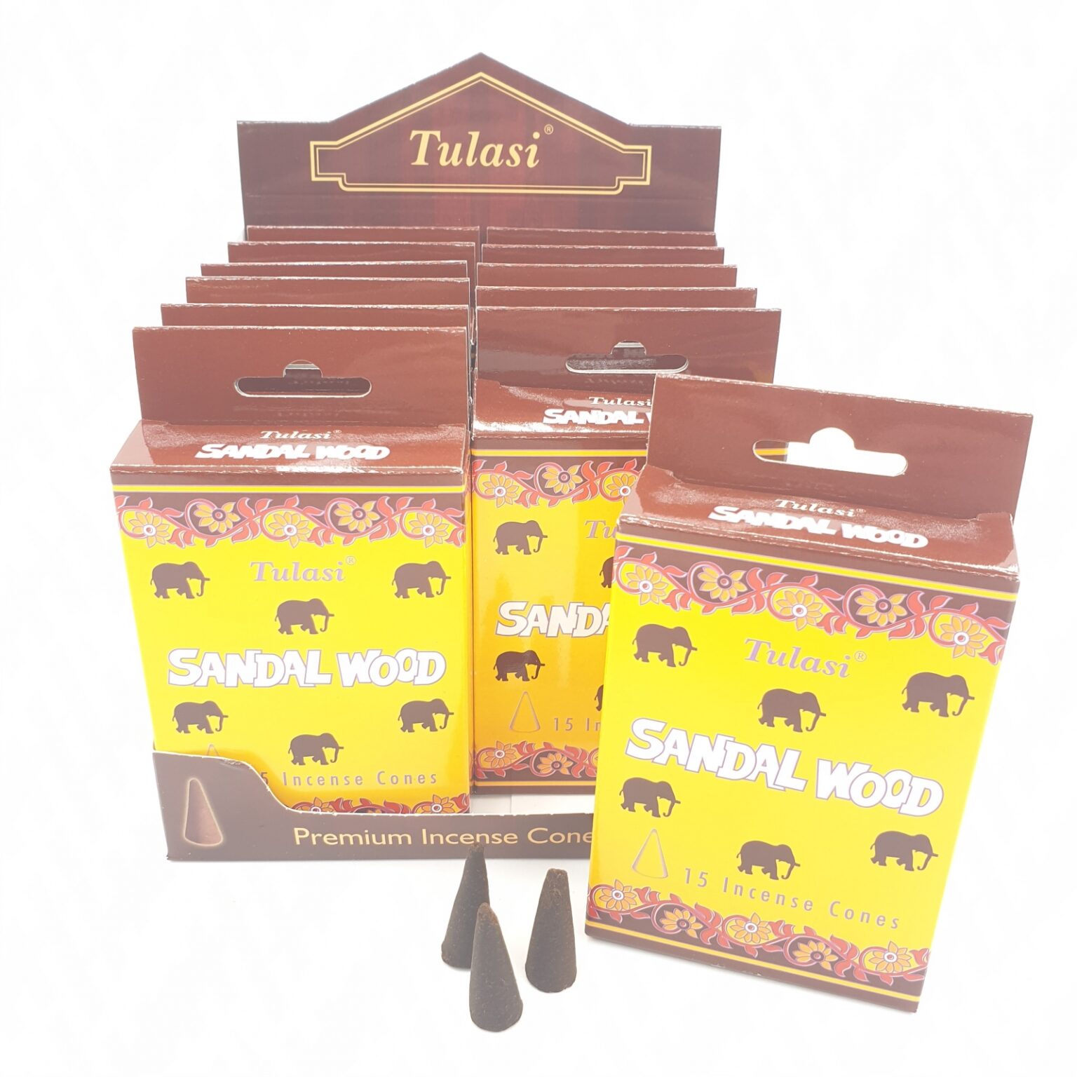 Tulasi Sandalwood Incense Cones offer a warm, woody fragrance that soothes the senses and uplifts the spirit. Each box contains 15 premium cones made from natural ingredients. Perfect for meditation, yoga, or creating a calming atmosphere at home. Enjoy the classic sandalwood scent in a convenient cone form.