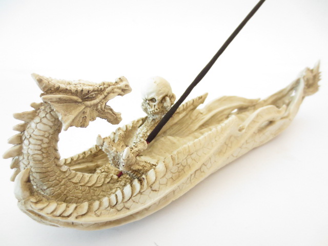 White fantasy dragon incense holder. The dragon is in lying form and has a skull in his leg.