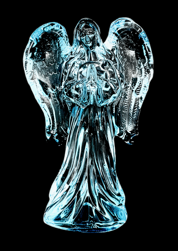 Standing praying angel figure with folded hands, detailed wings and flowing robe, made from crystal glass with a soft blue tint.