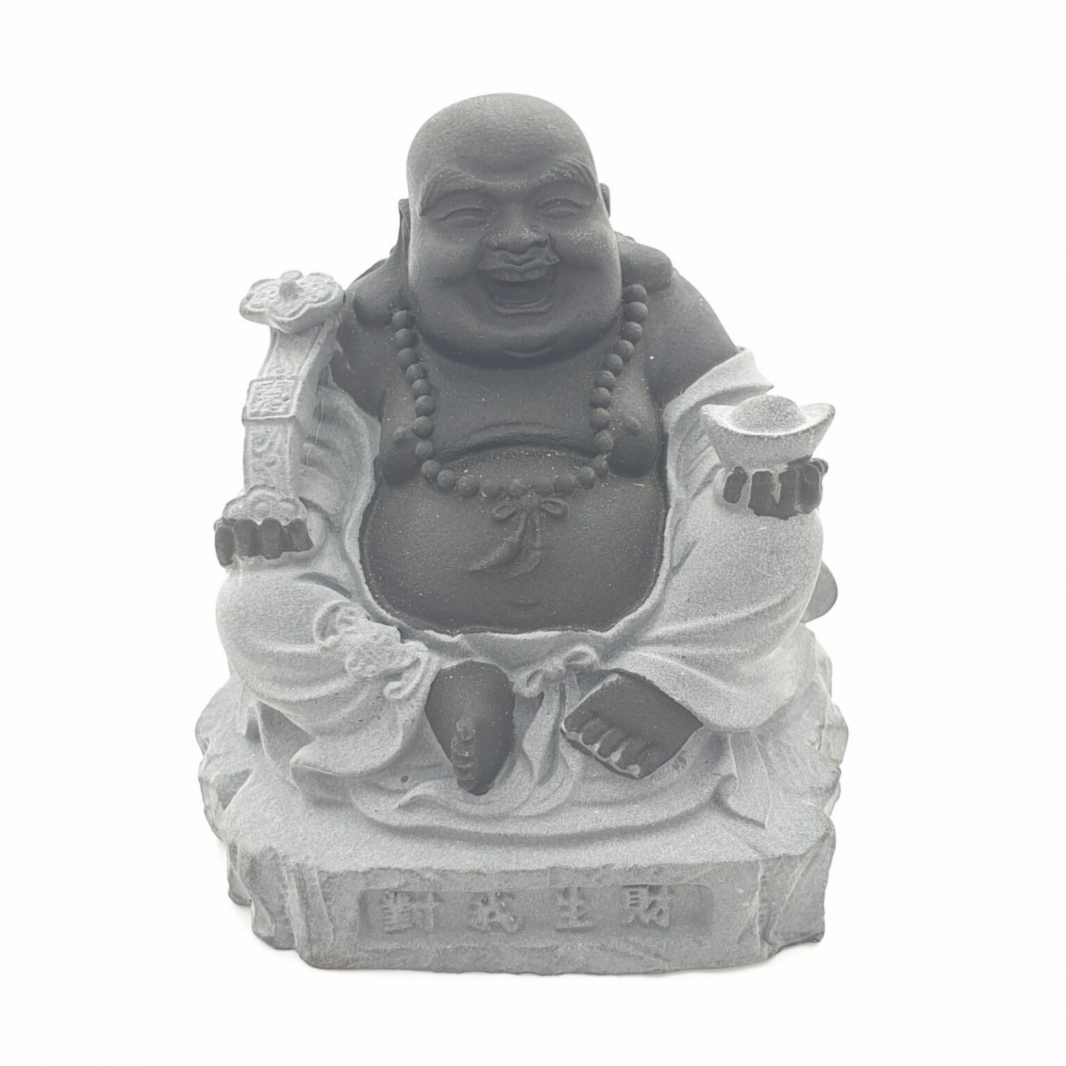 The happy Buddha stands for happiness, wealth and prosperity. The happy Buddha has a Yuni in his hands and a golden nugget.