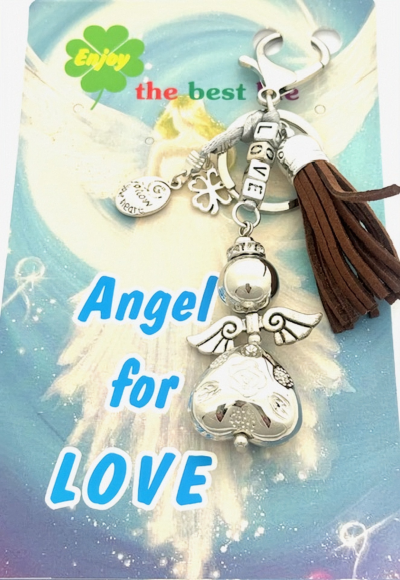 Wholesale – Dark Brown “LOVE” Angel Keychain with Tassel, Clover, and Tree of Life Charm