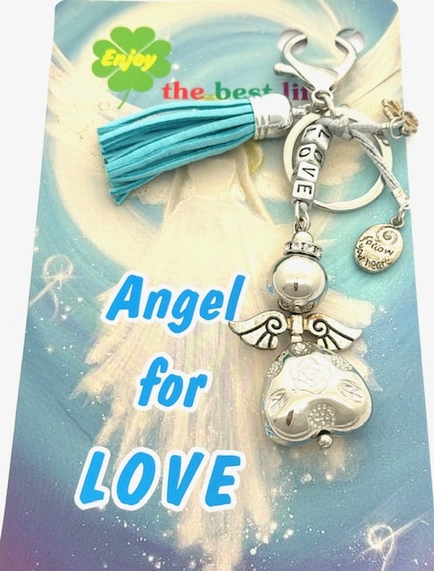 Wholesale – Turquoise “LOVE” Angel Keychain with Tassel, Clover, and Tree of Life Charm