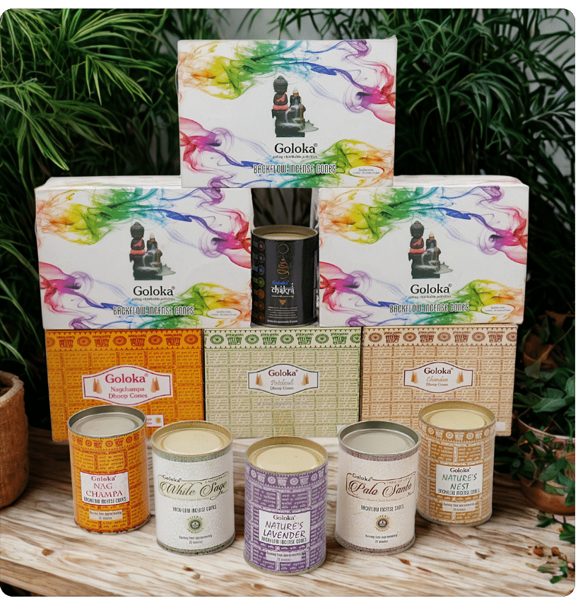 Summary: Category hub for Wholesale Goloka incense cones and Goloka backflow cones. This text highlights key scents like Nag Champa, Patchouli, Chandan, Palo Santo, Sandalwood, and Chakra. It explains the difference between standard and backflow cones. It also suggests matching burners for each type. You can find detailed information on each SKU page. EU/UK supply comes from our warehouse in the Netherlands.