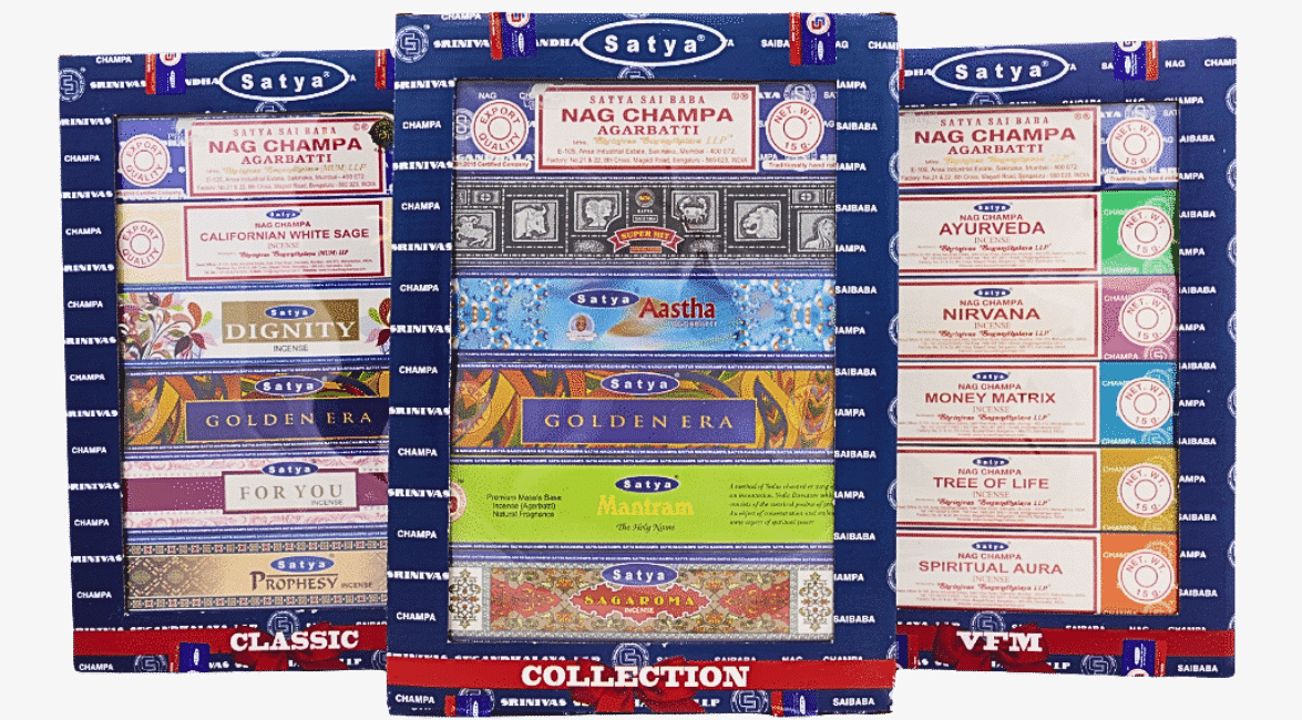 Wholesale Satya Incense Stick Giftpacks for retailers — ready-to-sell sets with popular Satya scents. These packs are neat and easy to display. Imported from India and stocked in Europe for fast turnover logistics. You can pair with our incense holders to create a complete package for your customers.